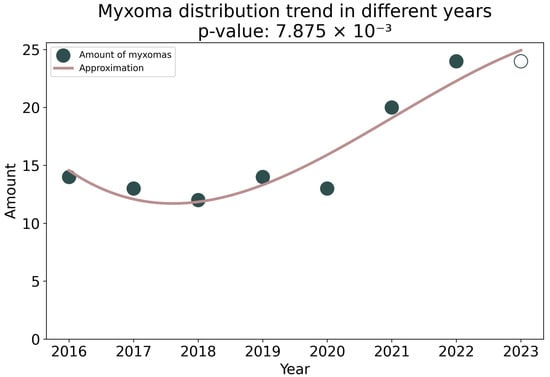 Cubic approximation of the amount of myxoma from 2016 to 2023. A trend toward an increase in the amount of myxoma is shown. The unfilled circle shows the expected number of mixomas in 2023.