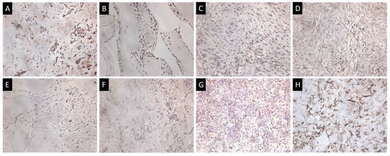 Immunohistochemical study of heart tumors. (A–D) Expression of spike ARS-CoV-2 in myxoma, papillary fibroelastoma, myxofibrosarcoma in the dedifferentiated zone of Grade 3 chondrosarcoma. (E–G) CD68+ macrophages in papillary fibroelastoma, classical myxoma and proliferating myxoma. (H) CD34+ cells in proliferating myxoma; ×200.