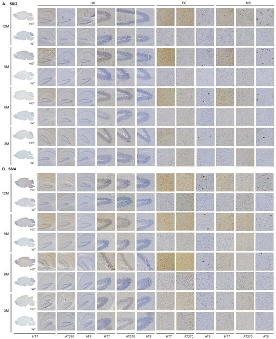 Immunohistochemical (IHC) analysis on the different age groups shows a clear spatiotemporal pattern. (A) IHC performed on the Tau58/2 mouse model. HT7 (whole brain sagittal, hippocampus (HC), frontal cortex (FC), and midbrain (MB)), AT8, and AT270 (hippocampus, frontal cortex, midbrain; magnification 40×) staining indicate a spatiotemporal spread from the spinal cord via the midbrain to the frontal cortex and hippocampus. (B) IHC performed on the Tau58/4 mouse model. HET = heterozygous, WT = wild-type.
