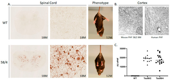 3.1. Phosphorylated Tau Load Increases with Aging in Tau58/2 and Ta58/4 Mice