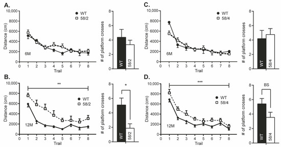 Performance of the Tau58/2 and 58/4 lines in the Morris water maze test for hippocampus-dependent visuo-spatial learning and memory. (A) Left panel: path length (distance) of Tau58/2 heterozygous (HET) mice (black dots) and wild-type (WT) control littermates (white squares) of 6 months of age during the acquisition trials in the MWM experiment. No significant differences were found in mice aged 6 months. Right panel: number of platform crossings during the probe trial of the MWM. (B) Left panel: path length of Tau58/2 HET mice and WT controls of 12 months of age during the acquisition trials in the MWM experiment. Two-way RM ANOVA indicated a significant difference between the learning curves of both genotypes (F(1) = 12.813; p = 0.002). Right panel: number of platform crossings during the probe trial of the MWM. Two-tailed Student’s t-test indicated that WT mice crossed the location of the removed hidden platform significantly more than HET mice aged 12 months. (C) Left panel: path length of Tau58/4 HET mice and WT control littermates aged 6 months during the acquisition trials of the MWM. Post hoc two-tailed Student’s t-test indicated a significant difference in the first trial as indicated by asterisks. Right panel: number of platform crossings during the probe trial of the MWM. WT and HET mice did not differ significantly in the number of platform crossings. (D) Left panel: path length of Tau58/4 HET mice and WT controls aged 12 months. Two-way repeated-measures ANOVA indicated a significant difference between the learning curves of both genotypes (F(1) = 15.471; p = 0.001). Right panel: number of platform crossings during the probe trial of the MWM. Two-tailed Student’s t-test indicated that WT mice crossed the location of the removed hidden platform more than HET mice aged 12 months, borderline significant (BS; p = 0.08). Each data point represents the summed mean (± SEM) across all performed trials or trial blocks. Significance is indicated by asterisks: * = p < 0.05, ** = p < 0.01, *** = p < 0.001. HET = heterozygous, WT = wild-type, MWM = Morris water maze, BS = borderline significant, RM ANOVA = repeated measures analysis of variance.