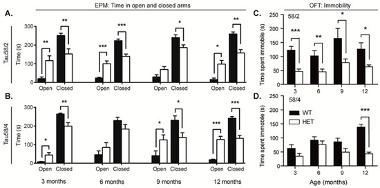 HET mice of both models spent more time in the open arms of the EPM and exhibited less immobility in the OFT. (A,B) Time spent in the open and closed arms of the elevated plus maze. HET animals of both models aged 12 months (58/2: t(13) = −3.278, p = 0.006; 58/4: t(25) = −2.293, p = 0.034) spent significantly more time in the open arms and less time in the closed arms (58/2: t(13) = 4.189, p = 0.001; 58/4: t(29) = 2.070, p = 0.047), indicating more exploratory and less anxiolytic behavior than WT littermates. These results are in agreement with results from the open field test, which indicated that HET animals of the Tau 58/4 model aged 9 and 12 months spent a significant longer time in the center circle of the open field (9 months: t(21) = −2.131, p = 0.045; 12 months: t(19) = −4.281, p < 0.001) and significantly less time in the corners (9 months: t(21) = 2.465, p = 0.022; 12 months: t(29) = 2.552, p = 0.016) in comparison with WT littermates. (C,D) Time spent immobile in the open field area during the open field test. WT animals of both models aged 12 months spent a significant longer percentage of time in an immobile state (freezing) compared with HET animals. For the 58/2 model, the difference at 12 months was smaller than that for the 58/4 model (t(29) = 3.928, p < 0.001). The immobility observed during the elevated plus maze indicated no significant differences. Data are presented as mean ± SEM. Statistical significance was determined with the two-tailed Student’s t-test. * = p < 0.05, ** = p < 0.01, *** = p < 0.001. HET = heterozygous, WT = wild-type, OFT = open field test, EPM = elevated plus maze.