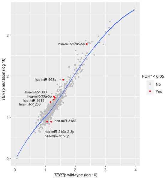 Scatter plot analysis of miRNA expression comparisons in tonsillar squamous cell carcinomas: TERTp-wild-type versus TERTp mutation. Significance was determined using the two-stage method of Benjamini, Krieger, and Yekutieli. * Significant, FDR < 0.05.