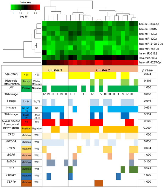 We performed an unsupervised hierarchical clustering analysis to examine the expression patterns of the nine dysregulated miRNAs (Figure 2). This analysis divided the tumor samples into two primary clusters. Cluster 2 exhibited greater expression levels of the six upregulated miRNAs and lower expression levels of the three downregulated miRNAs than Cluster 1. Notably, Cluster 2 had a significantly higher association with HPV positivity than Cluster 1 (HPV-positivity Cluster 1 (2/6, 33.3%) vs. Cluster 2 (15/16, 93.8%); p = 0.009). In contrast, Cluster 1 was predominantly HPV-negative and exhibited a tendency toward association with PIK3CA mutation, although this association was not statistically significant (p = 0.056).