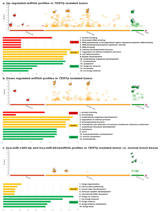 Top five Gene Ontology (GO) processes, ranked based on their enrichment scores (−log10 adjusted p-values using the Benjamini–Hochberg procedure), were identified for two sets of miRNAs. The first set (a) included six upregulated miRNAs (hsa-miR-1285-5p, hsa-miR-1203, hsa-miR-663a, hsa-miR-1303, hsa-miR-33a-5p, and hsa-miR-3615), whereas the second set (b) consisted of three downregulated miRNAs (has-miR-3182, hsa-miR-219a-2-3p, ahashsa-miR-767-3p) in TERTp-mutated tumors. Additionally, two upregulated miRNAs (hsa-miR-1285-5p and hsa-miR-663a) were compared with normal tonsil tissues (c). The functional terms were derived from various sources, including the Kyoto Encyclopedia of Genes and Genomes (KEGG) pathway, the biological process (BP) category of GO, the cellular component (CC) category of GO, and the molecular function (MF) category of GO.