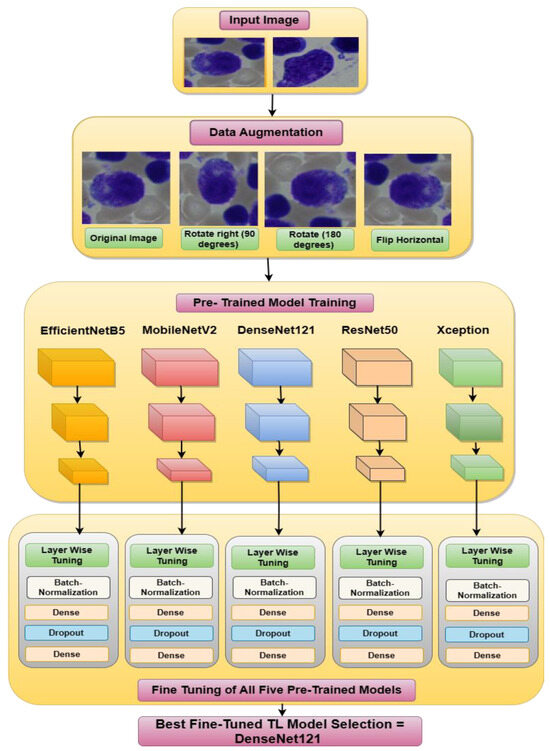 The need for more data is among the major issues facing the area of medical research. However, transfer learning may be used to solve this issue. By transferring the information from a pre-trained model to a new model, the transfer learning (TL) approach reduces the requirement for a big dataset [35]. Here, five transfer learning models were applied to the BM cells images to classify them into seven classes. The TL models used here were EfficientNetB5, MobilenetV2, DenseNet121, ResNet50, and Xception.