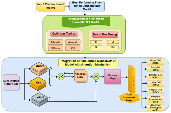 In the next step, this model is optimized with four different optimizers. A variety of optimizers are used in this optimization step, including AdaGrad, which modifies learning rates based on previous gradients; SGD, which iteratively updates weights using data subsets; RMSprop, which modifies AdagGrad for non-static objectives; and AdaDelta, which corrects AdaGrad’s diminishing learning rate. Different batch sizes (16, 32, 64, and 128) were explored in conjunction with these optimizers. After this, the integration of the DenseNet121 model takes place by adding an attention mechanism [32] to improve performance by allowing the model to focus on the most relevant features or regions of the image. The attention mechanism recapitulates the context-based data in the input sequence with variable length. Self-attention implements attention to a single context of data as compared to multiple contexts, therefore allowing direct long-distance interdependency. The proposed fine-tuned DenseNet121 model with self-attention, as illustrated in Figure 2, divides the DenseNet121 input feature map into three parts: Query, Key, and Value of the same shape as (Bsize × LQuery × Dmodel). These are the mean batch size, query length, and model dimension, respectively. The attention score was obtained by first convolution of the Query and Key, and then passing through the soft-max layer. The result of the attention process is the attention score, which is further convoluted with the Value. The feature map obtained through convolution process is passed to a fully connected layer. The final output of self-attention is used for the classification of BM cells into seven classes through the fully connected layer.
