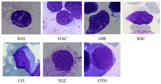 This work used the bone marrow cell classification dataset from Kaggle [28]. Applying May–Grunewald–Giemsa staining, about 170,000 labeled images of BM stains from 945 individuals were included in the collection. The images were captured using a light microscope with a 40-fold magnification and oil immersion. According to each image’s hematological condition or feature, there are 21 different categories for the BM, out of which, 7 classes were chosen for this study. These categories, along with their abbreviations, are listed in Table 1. Figure 3 shows sample images of these classes.