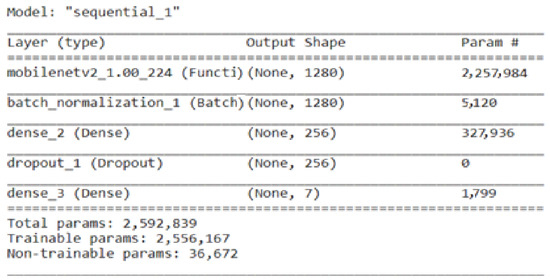 The basic concept of MobileNetV2 is to lower the computation complexity while preserving performance by combining depth-wise separable convolutions with linear bottlenecks. Convolution is divided into two independent layers by MobileNetV2. Each channel is individually subjected to a depth-wise convolution in the first layer, known as the depth-wise convolution [37]. The outputs of the depth-wise convolution are combined in the second layer, referred to as the point-wise convolution, using a 1 × 1 convolution. By factorizing the convolution procedure, this division minimizes the number of calculations. [20]. The MobileNetV2 pre-trained model is further fine-tuned by adding a batch normalization layer, a dense layer with a size of 256, along with a dropout layer, and a last dense layer with a size of 7. Figure 6 represents the total parameters, including the trainable and non-trainable parameters used here in the fine-tuned MobileNetV2 for classifying the BM dataset into seven classes.