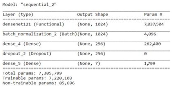 DenseNet refers to a “Densely Connected Convolutional Network”, which is renowned for its superior performance in image classification tasks. By creating dense connections between layers, DenseNet aims to solve the issue of vanishing gradients and promote feature reuse [38]. Each layer in a DenseNet is feed-forward directly linked to every other layer, creating dense connections (also known as skip connections) [30]. DenseNet-121 outperformed other well-known designs while keeping a manageably low number of parameters in various image classification evaluations. This DenseNet121 model was fine-tuned by adding a batch-normalization layer, a dense layer with a size of 256, a dropout layer, and last dense layer with a size of 7. Figure 7 represents the total parameters, including the trainable and non-trainable parameters used here in the fine-tuned DenseNet121.
