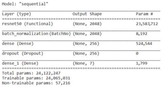 The inclusion of residual connections, also known as skip connections, is the main innovation of ResNet-50 and the ResNet family. These linkages make bypassing some layers and immediately propagating input from one layer to a deeper layer possible. As a result, the network is better equipped to deal with the vanishing gradient issue and lessen the degradation problem that frequently occurs with deeper networks. The residual block, which has two or three convolutional layers and identity shortcut connections, is the fundamental component of ResNet-50 [39]. ResNet50 is fine-tuned by adding a batch-normalization layer, a dense layer with a size of 256, a dropout layer, and a last dense layer with a size of 7. Figure 8 represents the total parameters, including the trainable and non-trainable parameters used here in the fine-tuned ResNet50 to classify the BM dataset into seven classes.