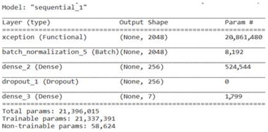 François Chollet, the Keras deep learning package developer, proposed the CNN architecture known as Xception. To attain a high degree of performance and efficiency, the central concept underlying Xception is to make use of depth-wise separable convolution, which was initially presented in the MobileNet architecture [39]. The spatial and channel-wise convolutions are separated by depth-wise separable convolutions, which reduce computing complexity while maintaining crucial data. It provides a strong balance between accuracy and computing efficiency, making it appropriate for deployment on devices with limited resources or in situations where real-time processing is required. The Xception model is fine-tuned by adding a batch-normalization layer, a dense layer with a size of 256, a dropout layer, and a last dense layer with a size of 7. Figure 9 represents the total parameters, including the trainable and non-trainable parameters of the fine-tuned Xception model.