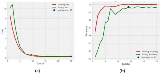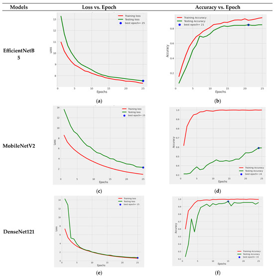 Figure 4 illustrates the graphical results of all five fine-tuned pre-trained models. At first, by utilizing the Adamax optimizer, these TL models were trained for 25 iterations with a Batch size of 40. Loss vs. Epoch (training and testing) and Accuracy vs. Epoch (training and testing) graphs are shown. In the graphs, a blue dot displayed the best epoch for which the model’s performance was optimum. Here, the green color represents the testing values, and the red color signifies the training values.