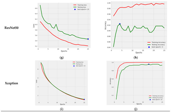 Figure 10a,c,e,g,h displays the graphs of the training and testing loss of the fine-tuned EfficientNetB5, MobileNetV2, DenseNet121, ResNet50, and Xception pre-trained models, respectively. It can be seen in the graph that the training loss and testing loss consequently decreased for all pre-trained models. At the same time, Figure 10b,d,f,h,i shows a graph of the training and testing accuracy of the models. Figure 10b shows that the training and testing accuracy of the EfficientNet model consistently rose. The model had its highest value on the 23rd epoch. Figure 10d shows that the testing accuracy of the MobileNetV2 model stayed the same at 59%. Figure 10f shows that the DenseNet121 model’s training accuracy reached nearly 99%, and its testing accuracy reached 95.45%. The best performance epoch was 20 for this model. ResNet50 model’s accuracy can be seen in Figure 10h, from which it can be seen that the testing performance of this model reached a value of 90%. At last, Figure 10j represents the Xception TL model’ accuracy, which consistently rose and reached 93.18%.