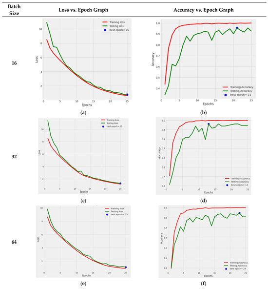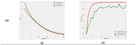 The performance graph of DenseNet121 with the Adamax optimizer and a batch size of 16 is shown in Figure 12a,b. The training and testing losses both steadily decreased, and the training accuracy became better with each passing epoch, while the testing accuracy value increased, with some ups and downs. The loss and accuracy graph of batch size 32 is shown in Figure 12c,d. From this, it can be seen that both losses continuously reduced, while the testing accuracy significantly fluctuated. The ideal epoch was 13, where the testing accuracy was at its greatest before slightly declining in value. The loss and accuracy graph for the 64 batch size is shown in Figure 12e,f. With little variations in the value, it can be observed that test accuracy rose. The ideal period when the testing accuracy was the most remarkable, was 25. The outcomes shown in Figure 12g,h are for a batch size of 128. From this graph, it can be seen that the losses steadily declined, while the testing accuracy value steadily rose. Here, when the testing accuracy was at its maximum, the optimal epoch count was 21.