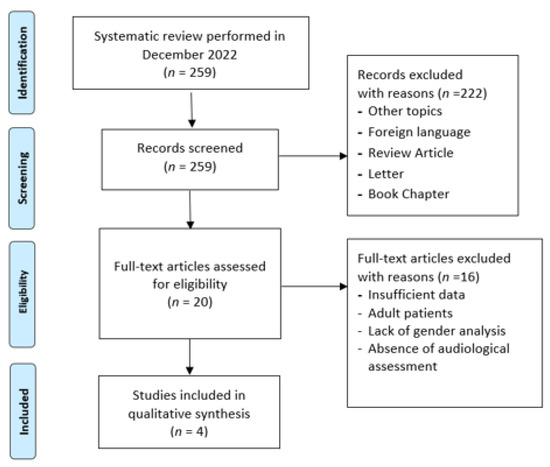 Flow diagram of the literature search, according to the PRISMA criteria (http://www.prisma-statement.org/, accessed on 1 April 2023), with the various steps in the manuscript selection process. The initially identified 259 manuscripts were reduced to 4 after the application of the selection criteria.