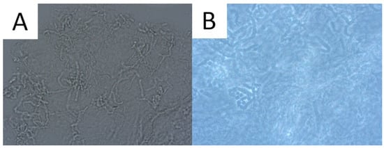 Direct microscopic examination is particularly used when the patient presents a typical clinical appearance of PV, but in Wood’s lamp examination, there is no characteristic fluorescence (e.g., after using shampoos with ketoconazole). Skin scrapings are dissolved with a mixture of potassium hydroxide (KOH) and dimethyl sulfoxide (DMSO) and evaluated under light microscopy and phase contrast microscopy. A characteristic appearance of roundish spores and elongated fungal hyphae resembles spaghetti and meatballs (Figure 2) [1,52]. As the highest concentration of fungi is noted at the lesion’s periphery [1,52], we recommend taking the sample from this area to achieve optimal reliability. As adding KOH provides no stain, methylene green, periodic acid–Schiff (PAS; with methylene green or fuchsin), or simply common blue ink can be used for better visualisation [1,67]. A simple scotch-test, involving the adhesion of cellophane foil to the scales, offers an alternative approach for collecting material suitable for staining and subsequent microscopic analysis [68]. Nevertheless, it should be kept in mind that direct microscopic examination with KOH does not provide 100% sensitivity [1,67], and that this method has not been standardised [3]. Thus, supplementary diagnostic tools may be used to obtain a wider context.