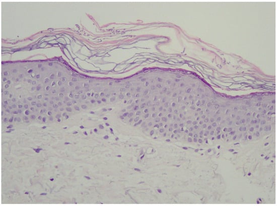 In the vast majority of PV cases, skin biopsy remains unnecessary and does not play a role in a daily practice other than for ruling out any of the differential diagnosis [1,22,23]. Thus, the authors advise considering faster and less expensive and less invasive alternatives described below. Histological findings include minimal epidermal changes, some grade of hyperkeratosis, and acanthosis [1,23]. Of note, contrary to what may be appreciated in other superficial mycoses caused by Trichophyton or Microsporon species, PV features spongiotic changes, whereas the superficial perivascular infiltrate in the dermis is absent or minimal [1,23,69]. Fungal elements can be visualised within the stratum corneum and can be present even in routine haematoxylin–eosin staining as, contrary to other superficial epidermal fungal infections, the spores and hyphal elements are basophilic [69]. Periodic acid–Schiff or Grocott–Gomori methenamine silver stains may further enhance the diagnostic accuracy [1,23] (Figure 3). The classic spaghetti and meatballs appearance may also be appreciated with this method (Figure 4). Hyperpigmented lesions tend to contain more hyphae and spores than the hypopigmented ones [4]. Also, hyperpigmented PV exhibits single, abnormally large melanosomes [70]. On the other hand, hypopigmented lesions feature mild hyperkeratosis and exhibit fewer and smaller melanosomes in the spinous layer when compared to healthy skin [4].