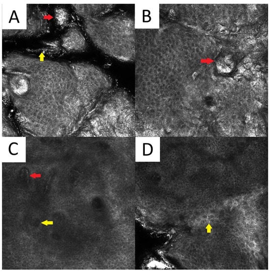 Reflectance confocal microscopy of pityriasis versicolor. Malassezia spores/meatballs (red arrow) and hyphae/spaghetti (yellow arrow) present in the stratum corneum (A). Presence of fungi can induce secondary morphological changes: hyperkeratotic plug (red arrow) inside the hair follicle (B); elongated vessels (red arrow) and vessels inside papillae (yellow arrow) present at the same level as the lower epidermal layers (C); epidermal spongiosis (yellow arrow) (D). Magnification 500×