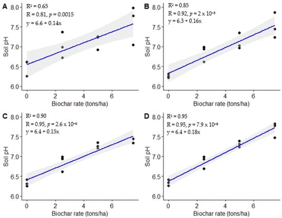 Relationship between biochar application rates and soil pH. (A) = 3 MAT, (B) = 6 MAT, (C) = 9 MAT, (D) = 12 MAT.