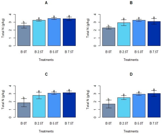 Soil total N under different biochar rates. Means presented with different letters in each graph differ substantially; “B = Biochar”, treatment rates are in t ha−1. (A) = 3 MAT, (B) = 6 MAT, (C) = 9 MAT, (D) = 12 MAT.