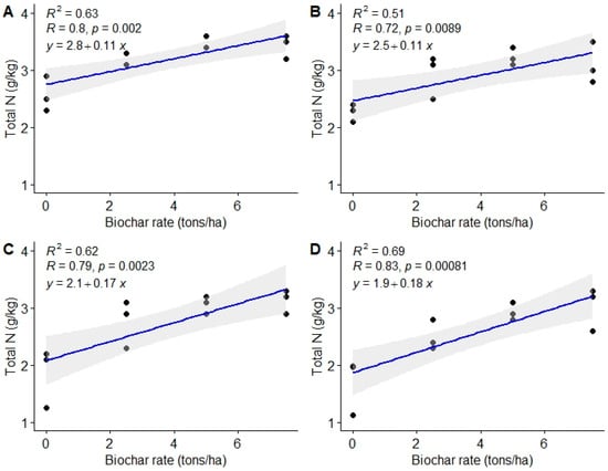 Relationship between biochar doses and soil total N. (A) = 3 MAT, (B) = 6 MAT, (C) = 9 MAT, (D) = 12 MAT.