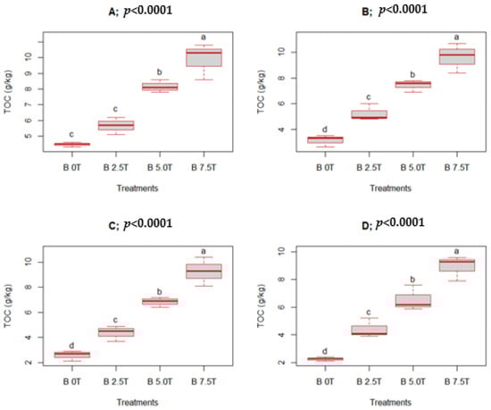 Soil total organic carbon (TOC) under different biochar rates: 3 MAT (A), 6 MAT (B), 9 MAT (C), and 12 MAT (D). Means presented with different letters in each boxplot differ substantially; “B” means biochar; treatment rates are in t ha−1.