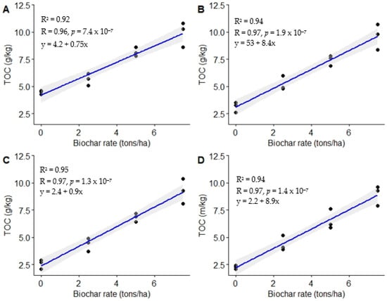 Relationship between biochar doses and total organic carbon. (A) = 3 MAT, (B) = 6 MAT, (C) = 9 MAT, (D) = 12 MAT.