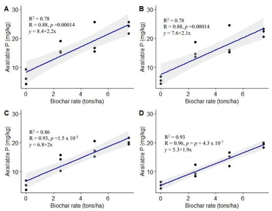 Relationship between biochar application rates and soil available P. (A) = 3 MAT, (B) = 6 MAT, (C) = 9 MAT, (D) = 12 MAT.