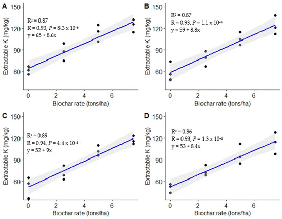 Relationship between biochar rates and extractable K. (A) = 3 MAT, (B) = 6 MAT, (C) = 9 MAT, (D) = 12 MAT.