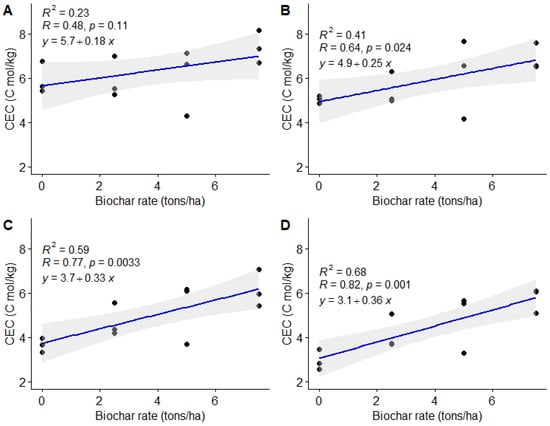 The study also revealed a substantial positive linear relationship between biochar doses and soil CEC (Figure 8). The Pearson’s correlation coefficient for the four assessment periods of 3, 6, 9, and 12 MAT were r = 0.48, 0.64, 0.77, and 0.82, respectively.