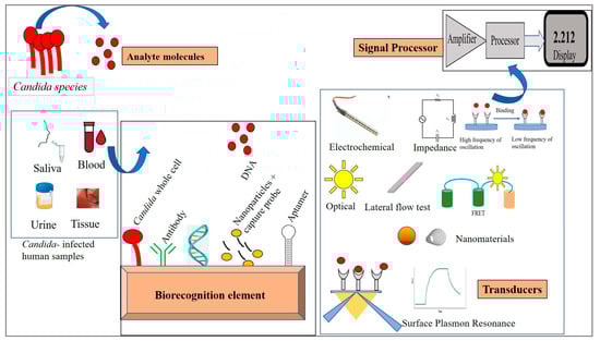 Traditional diagnostic methods for Candida infections, such as blood culture and microscopy, have several limitations that can lead to delayed or inaccurate diagnosis. These methods are time-consuming, require skilled personnel, and may not be sensitive enough to detect low levels of Candida species cells in clinical samples [19]. In addition, species identification using traditional methods can be challenging due to the high degree of phenotypic similarity between different Candida species [20]. Furthermore, conventional methods may not be able to detect antifungal resistance, which is becoming an increasingly important issue in the management of Candida infections [21]. Therefore, there is a need for more innovative, rapid, and accurate approaches for the detection and identification of Candida species. Biosensors are the appropriate tools in this approach. Generally speaking, biosensors offer rapid and accurate detection of Candida species, which can lead to earlier diagnosis and treatment; can be more cost-effective than traditional diagnostic methods; can be used for real-time monitoring of circulating analytes, which can reflect the efficacy of antifungal treatment; and can be designed to be portable and easy to use, making them suitable for point-of-care diagnosis [22,23].