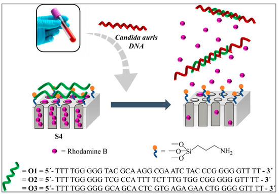 Figure 3. Schematic representation of the gated NAA support and the selective uncapping and dye delivery in the presence of C. auris genomic DNA (image courtesy of Pla et al., 2021, under Creative Commons CC BY license [74]).