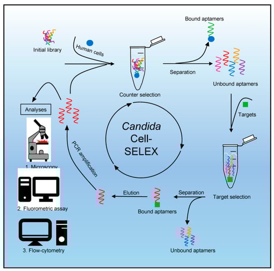Figure 4. SELEX process and analytical techniques. The process starts with a counter selection where an initial single-stranded (commercial) aptamer library (TriLink BioTechnologies, Inc., San Diego, CA, USA) with approximately 6 × 1014 individual molecules is incubated with human cells as the counter target. Bound aptamers can be removed by a washing step to exclude them from further selection. The focused library is used in a target selection by incubating it with target cells (Candida). Aptamers that do not bind to target cells are removed by washing. The aptamers specifically bound to the cells can now be eluted, amplified by polymerase chain reaction (PCR) using Cy5 and phosphate-labeled primers, and then subjected as single-stranded molecules to different analysis techniques after strand separation, which is achieved by strand digestion with lambda exonuclease. This process is repeated to obtain a specific polyclonal aptamer library for Candida after sufficient rounds of target binding and PCR-mediated amplification. Analytical techniques include (1) fluorescence microscopy, (2) fluorometric assay, and (3) flow cytometry. Image courtesy of Kneißle et al., under Creative Commons Licence [55].