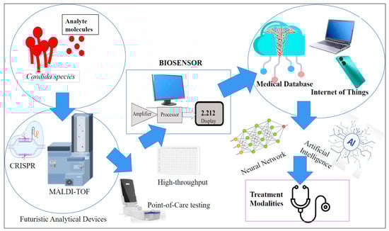 Sudden fungal outbreaks can be tackled with revolutionary concepts in the field of biosensors with sensitivity down to picomolar (10−12 M), femtomolar (10−15 M), and attomolar ranges (10−18 M). Hence, next-generation approaches based on molecular techniques such as polymerase chain reaction (PCR), DNA-sequencing-based methods, protein fingerprinting by matrix-assisted laser desorption/ionization–time-of-flight mass spectrometry (MALDI-TOF-MS), and ultrasensitive laser-based technologies that target specific Candidal biomarkers [12] are commonly used techniques nowadays. Alongside wearable sensors, artificial intelligence, cloud computing, data management, the Internet of Things (IoT), biomedical database management, highly skilled personnel, and decision-makers. will aid in this direction [16]. The fundamentals of computer science and technology—artificial intelligence and neural networks—have crept into the field of biosensors too. A biosensor is a bio-analytical device used for detection purposes. Micro-electro-mechanical system (MEMS) cantilever biosensors are a class of prospective biosensors with high levels of miniaturization, embedded microelectronics, intelligence, mass production, and low budget [17]. A micromechanical cantilever array sensor was designed to monitor yeast hyphal growth and selective immobilization in real time using microbeam biosensors as early as 2005 [18].