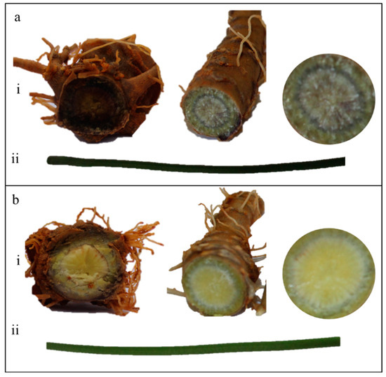 (a) Natural variant and (b) standard variety “Sanqi” (i) root and (ii) stem cuttings showing differences in color.