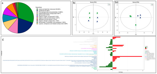 The processed data were subjected to multivariate data analysis, including Pareto-scaled principal component analysis (PCA) and orthogonal partial least-squares discriminant analysis (OPLS-DA), after being adjusted to total peak intensity. The model’s robustness was assessed using 7-fold cross-validation and response permutation testing. Each variable’s VIP (variable significance in the projection) value in the OPLS-DA model was calculated to indicate its contribution to categorization. Metabolites with VIP values greater than one were subjected to a univariate Student’s t-test to determine the significance of each metabolite; p values less than 0.05 were considered statistically significant.
