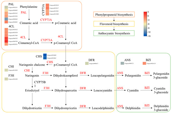 Differential expression of genes enriched in phenylpropanoid, flavonoid, and anthocyanin biosynthesis pathways. The heatmaps show log2 FC values of the DEGs (HS vs. ZS). The genes given in red are differentially expressed. PAL, phenylalanine ammonia lyase; 4CL, 4-coumarate:CoA ligase; CYP73A, cytochrome P450 CYP73A100; CHS, chalcone synthase; CHI, chalcone isomerase; F3H, flavonoid 3-hydroxylase; DFR, dihydroflavonol reductase; ANS, leucoanthocyanidin dioxygenase 1; BZI, anthocyanin 3-O-galatosyltransferase.