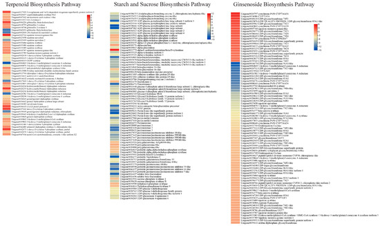 Heatmaps of differentially expressed genes enriched in terpenoid biosynthesis pathways (mono-, di-, tri-, sesquiterpenoids, and terpenoid backbone), starch and sucrose biosynthesis pathways, and ginsenoside biosynthesis pathway. The heatmaps express log2 fold change values. The unigene names are followed by KEGG annotation of the genes.