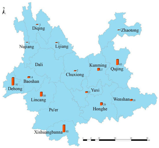 The site locations selected for sample collection. The exact location and number of samples are mentioned for areas of Yunnan Province in China.