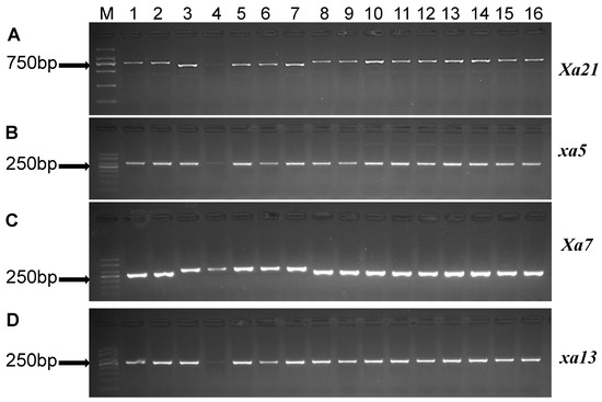 Amplification patterns of polymorphic markers pTA248, xa5FM, STSP3 and xa13-prom. PCR products amplified from genomic DNA of representative rice landraces, (A) marker pTA248 for Xa21, M = DL 2000 DNA ladder, (B) marker xa5FM for xa5, M = 50-bp DNA ladder, (C) marker STSP3 for Xa7, M = 50-bp DNA ladder, (D) marker xa13-prom for xa13, M = 50-bp DNA ladder. Lanes 1–16 represent representative samples of rice landraces collected from Yunnan Province.