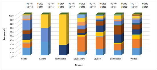 The PCR amplification of the Xa21, xa5, Xa7 and xa13 genes revealed that the majority of rice samples have functional pTA248, xa13prom and STSP3 markers [34,37]. The results indicated that ~750 bp band for Xa21 marker was amplified, while, for xa5 and Xa7, approximately 280 bp and 250 bp bands were amplified (Figure 2). Similarly, a band of ~280 linked to xa13 marker was amplified. Molecular analysis indicated that the Xa7 and Xa21 R genes were widely distributed in central (37.5 and 11%) and southwestern (26.3 and 41.2%) regions, while the southeastern region was mainly dominated by Xa21 R gene (63.4%). However, in the eastern region, none of the plants showed any level of Xa21 R gene amplification (Table 3 and Figure 3). It is noteworthy that the germplasm carrying Xa21 and Xa7 was found to be resistant. The plants showing susceptibility despite of the presence of Xa21 and Xa7 (Table 3) can be related to the higher pathogenicity level of Xoo strains [38,39,40]. Remarkably, even the presence of single allele Xa7 or Xa21 showed a complete level of resistance (Table 3). However, the germplasm carrying xa5 and xa13 were highly susceptible and did not show any detectable level of resistance.