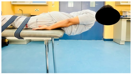 Lumbar extensor endurance, a pivotal aspect of this study’s assessment protocol, was evaluated using the Sorensen test, also known as the trunk extensor endurance test [32]. This assessment is well-established and exhibits a high level of reliability (ICC [1,1] = 0.88; 95% CI, 0.73–0.95) when measuring the endurance capacity specific to the lumbar extensor muscles [33]. Participants were positioned in a prone (face-down) orientation on an examination table, ensuring that their upper body remained unsupported (Figure 1).