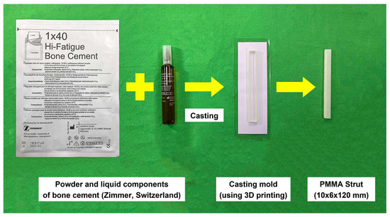 Powered MMA–styrene co-polymer (bone cement) and liquid MMA monomer are mixed to cast the prismatic-shaped PMMA strut (dimension: 10 × 6 × 120 mm).