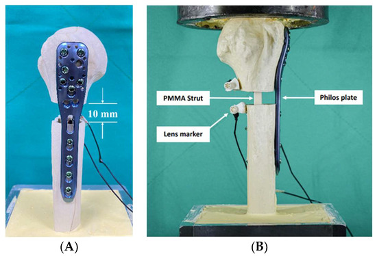 (A) Philos plate was fixed using locking screws and a 10 mm osteotomy gap was created to simulate the comminuted (unstable) fracture; (B) LED lens markers, PMMA strut, and experimental setup.