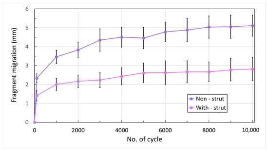 The measured fragment migration between 100 to 10,000 cycles under 450 N loading increased from 2.3 to 5.1 mm for the non-strut group and 1.4 to 2.7 mm for the PMMA strut group (Figure 4). The fragment migration values of the with-strut (augmented with PMMA strut) group demonstrated approximately 2 times (1.99 ± 0.18) lower than that of the non-strut group. Moreover, the total change in gap distance under 450 N load was significantly less in the PMMA strut group than in the non-strut group at all time intervals up to 10,000 cycles (p < 0.05).