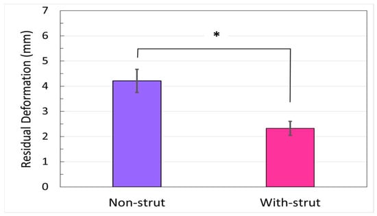 Figure 5 illustrates the residual deformation of the osteotomy gap after 10,000 loading cycles for two groups (mean ± SD). The cumulative plastic deformation (residual deformation) in the non-strut group was approximately 1.8 times (1.83 ± 0.26) higher than in the augmented group (4.21 ± 0.46 mm vs. 2.32 ± 0.28 mm; p < 0.001).