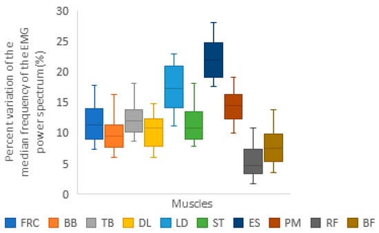 During fatigue, there is a significant increase in EMG activity in almost all of the muscles involved between the first and second phases. The progressive increase stopped when a certain threshold of overall fatigue was reached, defined as the “mechanical failure point” [44]. This point corresponded to approximately 12% of the average assessed muscle fatigue. However, it should be stressed that this is only a general view, as various factors, such as synergistic muscle interactions between agonists and antagonists, can limit the contractile capacity of a given muscle, even if it is not completely exhausted [45].