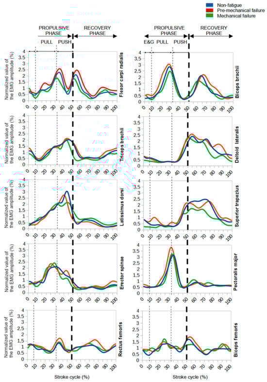 Table 3 and Figure 3 provide a detailed analysis of the variations in EMG activity during different phases of the stroke cycle. Specifically, these changes are observed between the non-fatigue phase and both the pre-mechanical failure and mechanical failure phases.