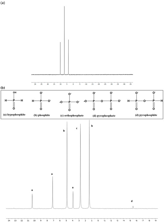 The pH of the starting DI (deionized) water was around 6. Sodium hypophosphite (NaH2PO2) was used as a source of the reduced P material for the Fenton reaction to generate various oxidized forms of inorganic P, along with the condensed phosphates. 31P-NMR analysis of the starting material showed no other P peaks as impurities (Figure 1a). Fenton reactions were formed by the previously reported method [41,48]: aqueous solution of equimolar (0.2 M of both) hypophosphite (H2PO2−) and FeCl2.4H2O (equal volumes, 0.1 M total of each reagent) were mixed and dissolved to form an homogenous solution. The total volume of this solution was 20 mL (10 mL for each of the solutions described above). To this solution mixture, 15 mL of 0.50 M H2O2 was added dropwise.